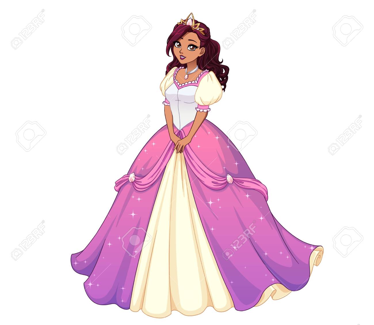 Pretty Cartoon Princess Standing And Wearing Pink Ball Dress Dark Curly Hair Big Brown Eyes Hand Drawn Vector Illustration Isolated On White Background Royalty Free Svg Cliparts Vectors And Stock Illustration Image